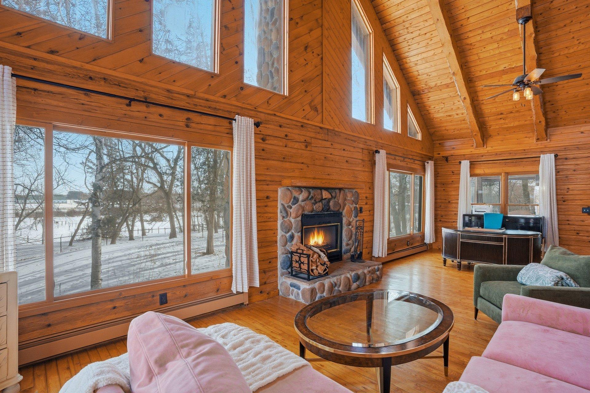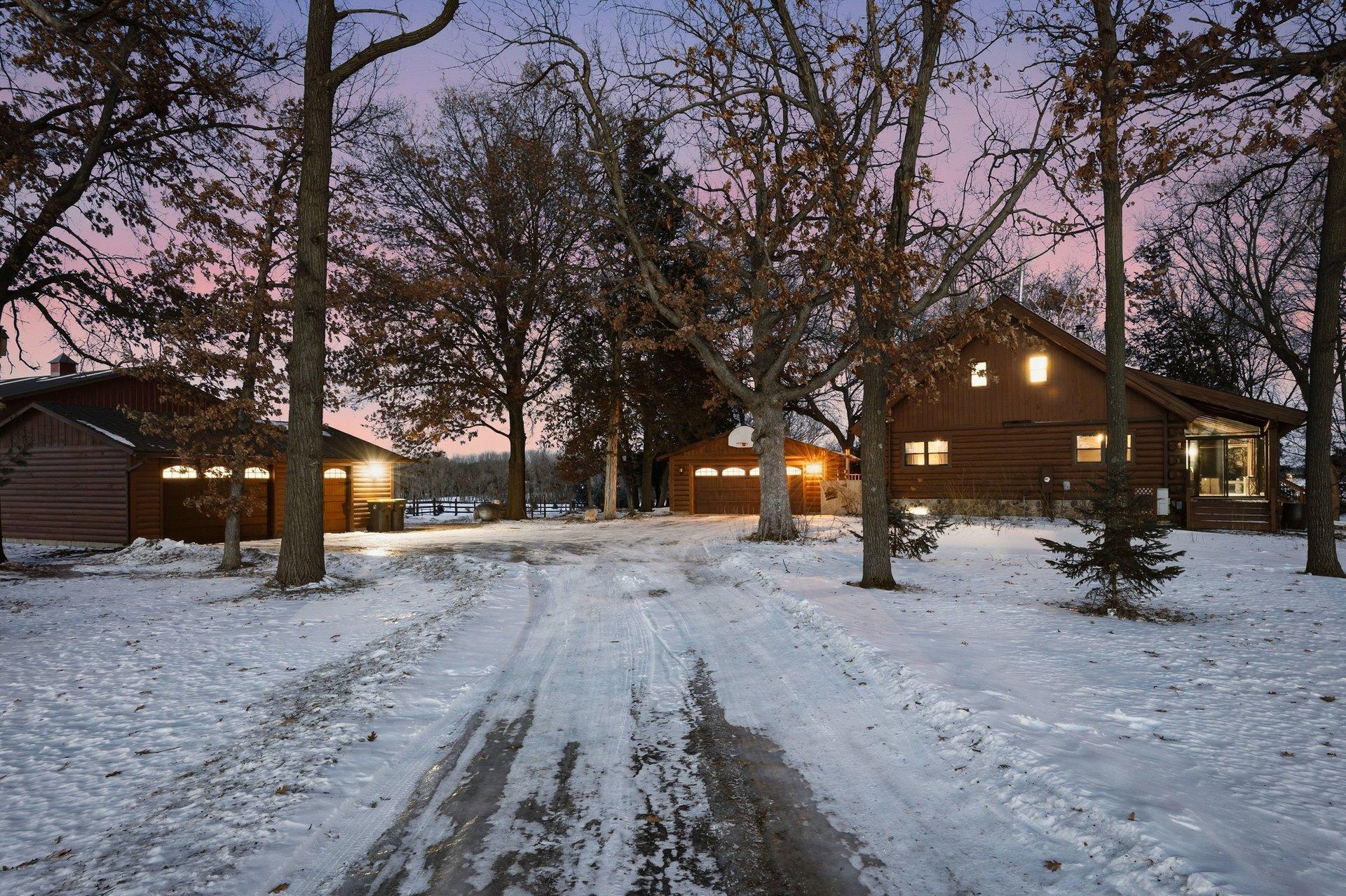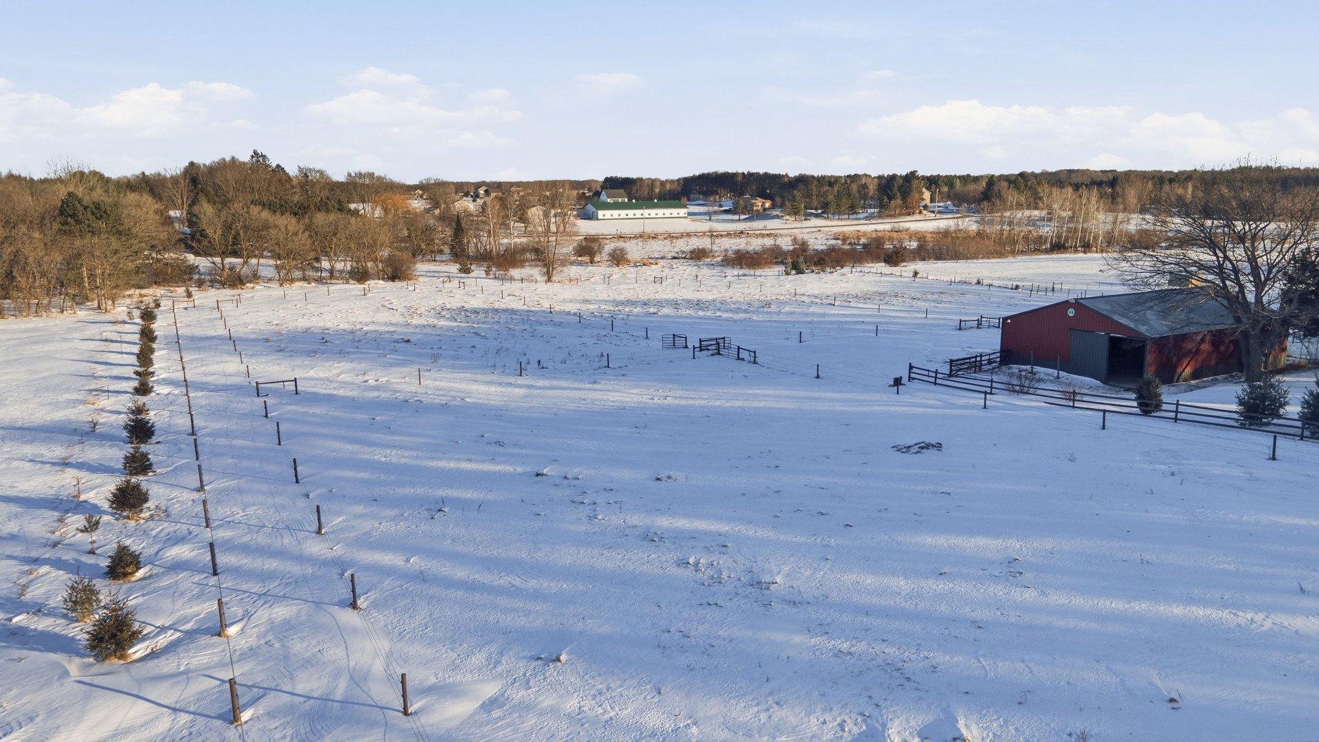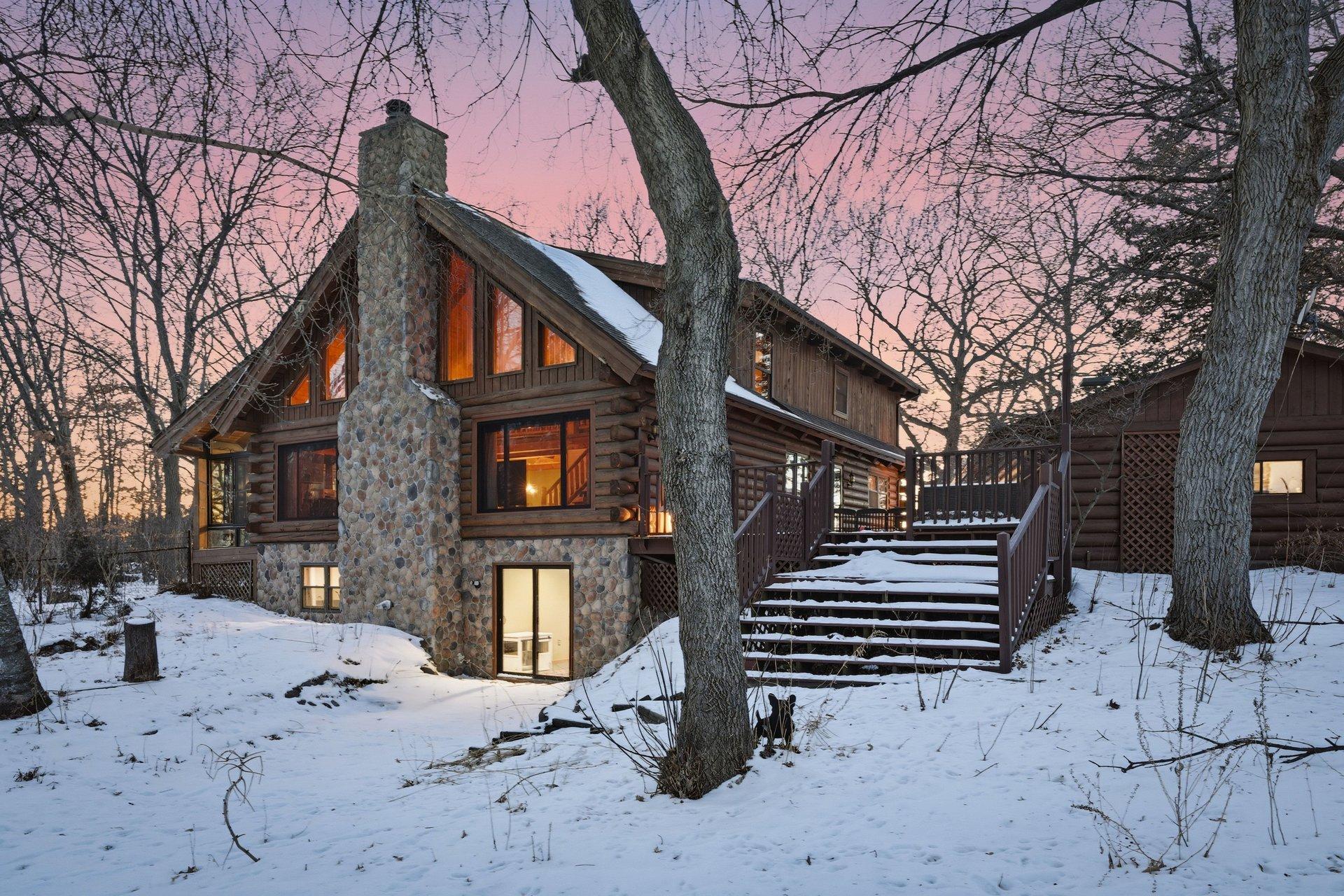 Experience the freedom of country living in this stunning custom log home set on 12.7 private, tree-lined acres. Tucked among mature trees with open pastures and wide skies, this property offers the kind of space and serenity that's increasingly hard to find -- whether you envision a fully equipped horse setup, hobby farm, recreational retreat, or simply room to breathe. Designed with equestrian living in mind, the land is thoughtfully arranged with fully fenced pastures, automatic waterers, eight stalls, and two dedicated tack rooms -- truly move-in ready for horses. Two impressive pole buildings provide exceptional flexibility: an 80x50 Morton barn with 30-amp RV hookup and a 50x30 secondary building with water, electricity, lighting, and concrete floors. Store trailers, equipment, recreational vehicles, or create workshop space -- the possibilities here are extensive. A third garage and an extra-deep attached two-car garage with a wood-burning stove add even more functional space for projects, storage, or year-round use. Inside, the home blends rustic character with comfortable living. The loft-style primary bedroom offers a bright, open retreat overlooking the home's main living space. It currently embraces an airy, open-concept design, but also provides the opportunity to easily add a wall and door for enhanced privacy if desired -- allowing you to tailor the space to your lifestyle. The primary bathroom features a walk-in shower, soaking tub, and peaceful views of the surrounding acreage. Hardwood floors span the main level, and the lower level offers flexible finished space ideal for a family room, fitness area, home office, or recreation space. Large windows throughout the home invite in natural light and frame scenic views in every season. Outdoors, enjoy evenings by the fire, morning coffee overlooking your pastures, and frequent wildlife sightings including deer and sandhill cranes. A designated dog area and well-maintained fencing make the property both practical and enjoyable. With approximately 15 minutes to Forest Lake and just 8 minutes to Chisago City or Lindstrom -- plus easy access to Highway 35 and surrounding communities -- you can enjoy peaceful country living without sacrificing convenience. This is more than a home -- it's a lifestyle property offering privacy, flexibility, and room to create the life you want.